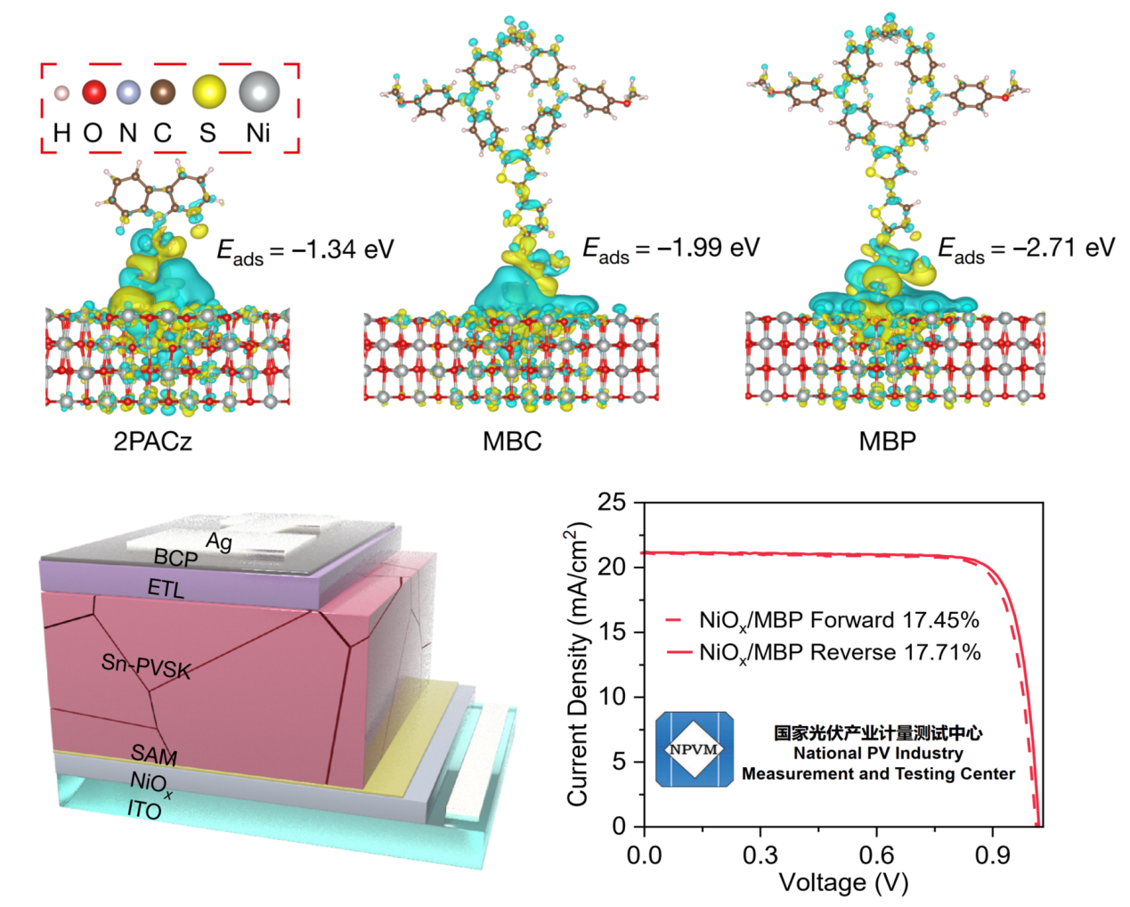 近日,国际顶级期刊《Nature》上刊登了题为“Tin-based perovskite solar cells with a homogeneous buried interface”的研究论文。该论文第一作者为化学化工学院21届硕士毕业生李天朋,我院芮一川老师等为共同作者。该成果将新型自组装单分子材料引入锡钙钛矿薄膜埋底界面,构建了能级匹配的均匀界面层,实现了空穴提取效率的显著提升;同时该分子薄膜形成的超润湿下层可诱导钙钛矿晶粒定向生长,使薄膜缺陷密度降低40%以上,最终制备的锡钙钛矿太阳能电池认证效率到达17.71%,刷新了世界纪录。