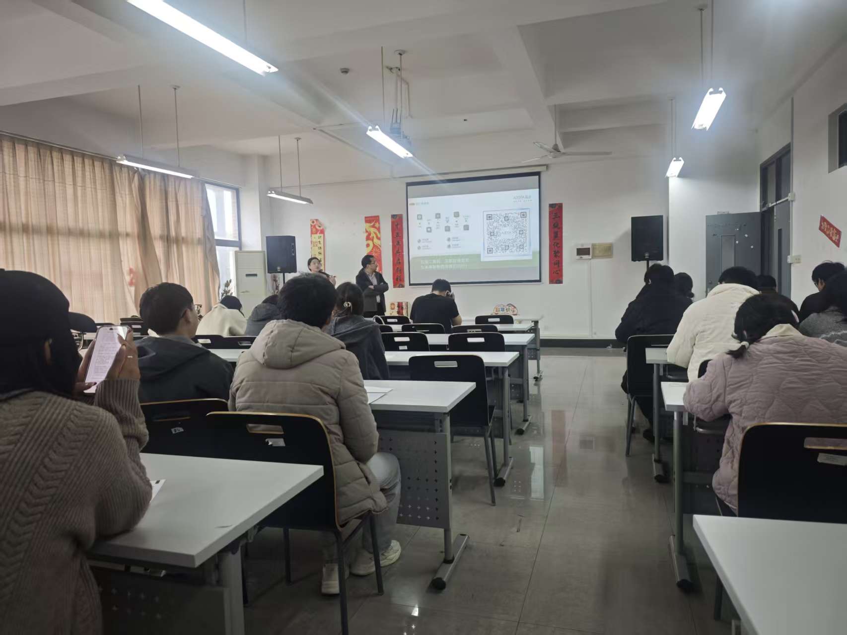 宣讲会摒弃了冗长的企业介绍,由普洛创智实验室方主任主讲,通过投影展示创新药研发全流程,激发全体到场毕业生的浓厚兴趣,瞬间点燃了现场气氛,互动区围满了跃跃欲试的同学。